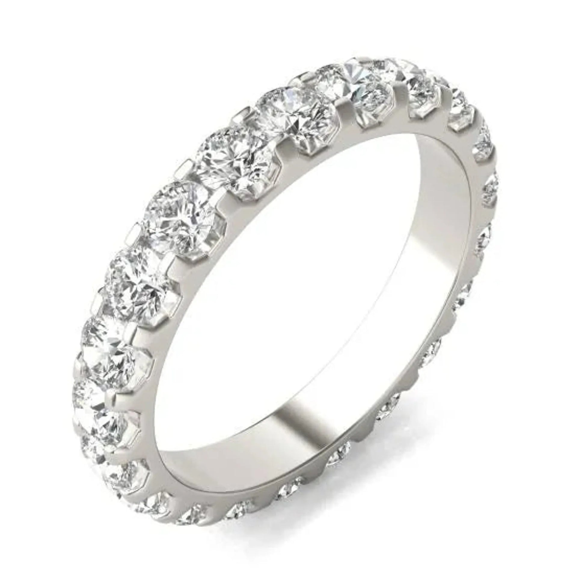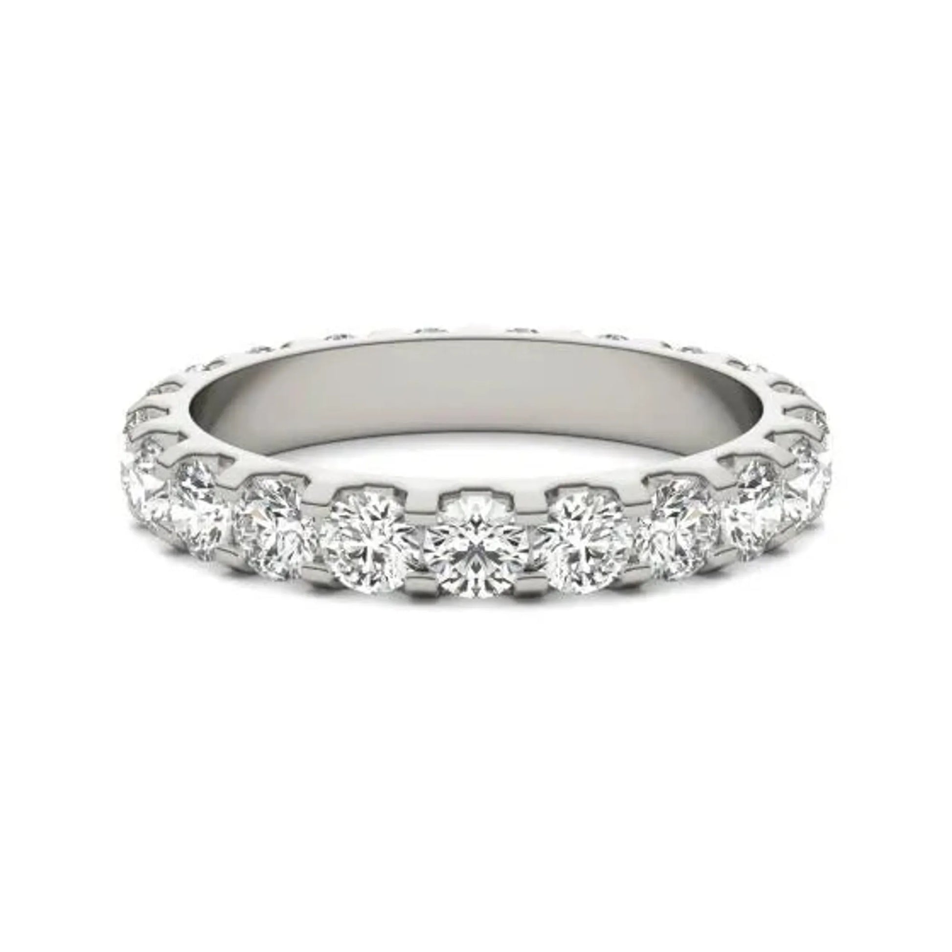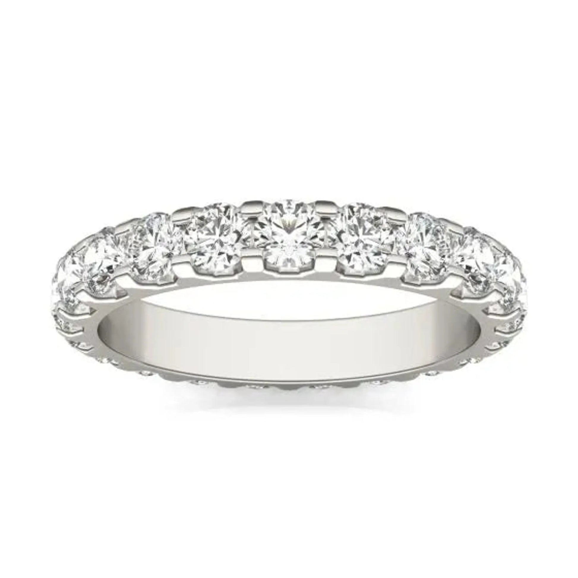 Made in USAProduct Details:Show your eternal love with this classic lab-grown diamond band. Twenty 3.0mm round stones are set in a 14K white gold band. A ring that is Forever theirs. The Stone Weight and Carat Total Weight (CTW) represent the approximate weight of each of the diamonds in the complete set. Each stone may vary no more than 1/15 below the total stated weight.Specification: